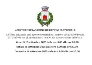L’Ufficio elettorale sarà aperto o reperibile al numero 0583/694071 o allo 347 2825463 per gli adempimenti relativi alla sottoscrizione delle liste: